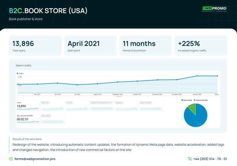 Promotion of the online bookstore on the USA market has been a success due to a comprehensive approach that includes SEO strategy, website redesign, usability improvements, contend optimization and external promotion. Despite the assortment of rather niche products and high competition, the organic traffic has shown more than 100% growth and the conversion rate has increased by 32%. Users’ engagement has also greatly improved and the number of cooperating authors has increased 2-fold. Today the website is continuing to improve and we’re expecting it to demonstrate further successful results.