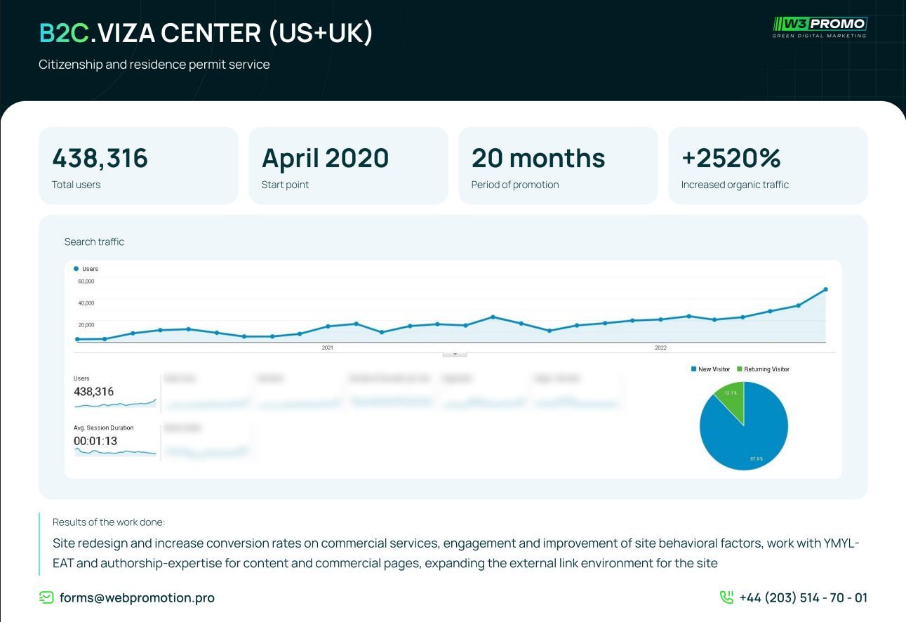 Thus the improvement of the website with strong emphasis on SEO, content quality and trust from users have made a solid foundation for successful business transformation. Not only has the cooperation with Web Promotion helped our client’s company to expand its business audience, but also to reinforce its positions on the visa services market and provided stable growth and development in the international area.